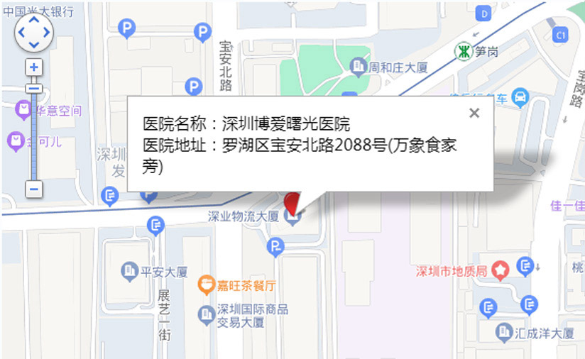 深圳博愛曙光醫院來院路線地址聯系信息 醫院地址:羅湖區寶安北路2088號(萬象食家旁) 交通指南:深圳地鐵7号線筍崗站A出口 服務時間:(無假日醫院)8:30-21:00 地鐵:地鐵7号線筍崗站A出口,直行50米公交站台: (1)筍崗街道辦站:18路、303路、322路、323路、366路、371路、381路、63路、69路等。 (2)市安全教育基地站:18路、321路、322路、366路、381路、63路、225路等。 (3)人才市場站:57路、M406路等。 (4)梅園路①站:333路、371路、57路、69路等。